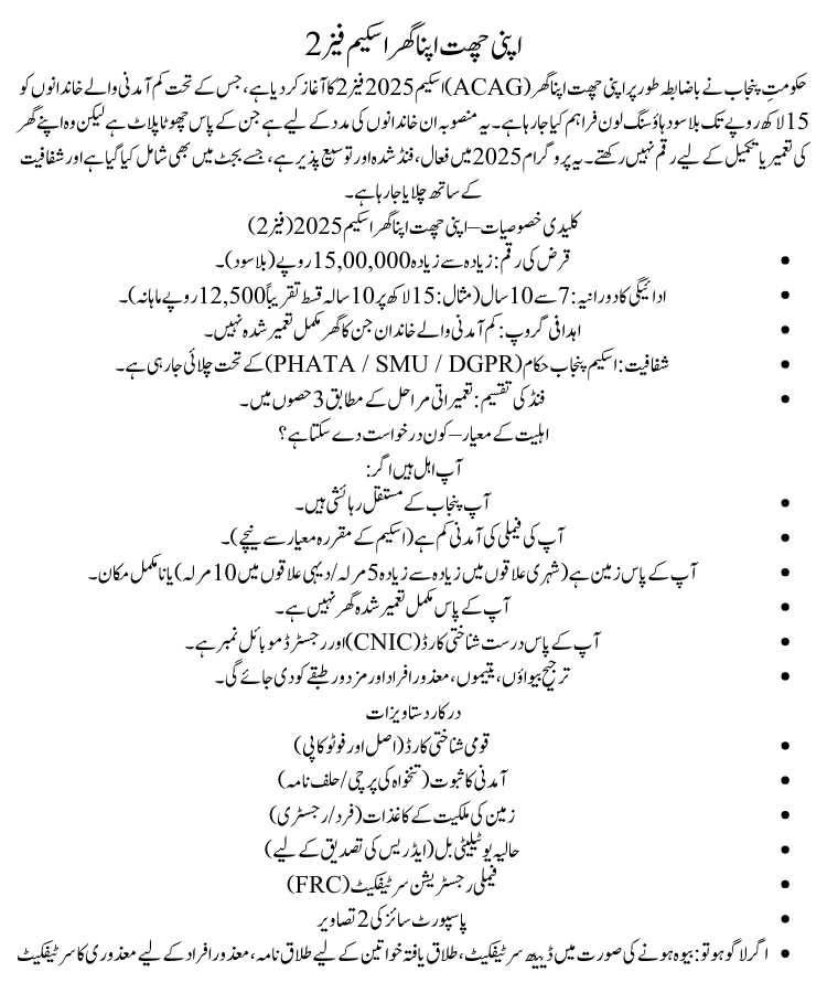 The Punjab Government has officially launched Phase 2 of the Apni Chhat Apna Ghar (ACAG) Scheme 2025, offering interest-free housing loans up to Rs 1.5 million. This initiative aims to support low-income families who own a small plot but cannot afford to build or complete their houses. The program is active, funded, and expanding in 2025, with budget allocations and government confirmations ensuring transparency.