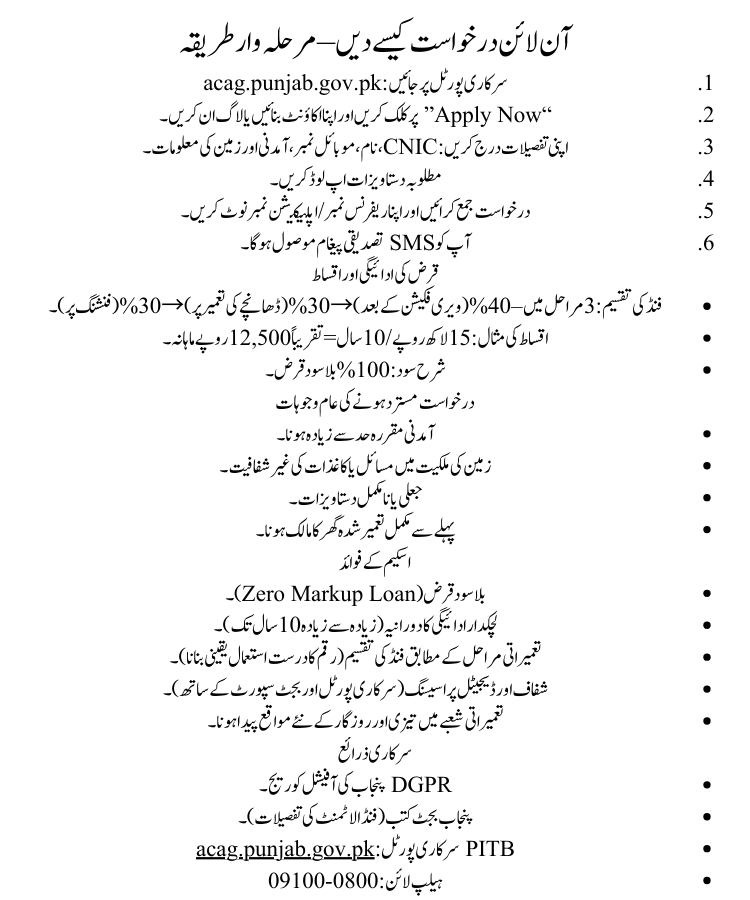 Low-income Punjab residents with land but no completed house. Priority for widows, orphans, disabled.